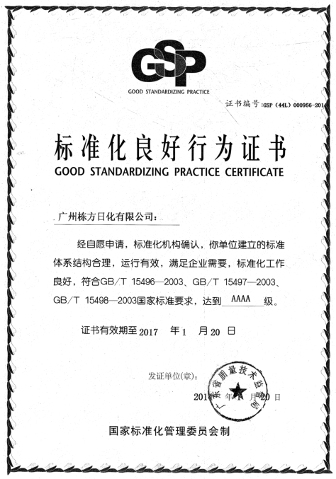 2017年4月20日,廣州市質(zhì)量監(jiān)督檢測研究院與標(biāo)準(zhǔn)化研究院組織6人評審組,對廣州棟方生物科技股份有限公司進行了“標(biāo)準(zhǔn)化良好行為企業(yè)”首次復(fù)審。經(jīng)一系列嚴苛的資料審核、現(xiàn)場確認等程序,棟方股份以總計465的高分(總分500)優(yōu)勢,順利通過專家評審組的一致確認,繼續(xù)保持“國家AAAA級標(biāo)準(zhǔn)化良好行為企業(yè)”的榮譽稱號。