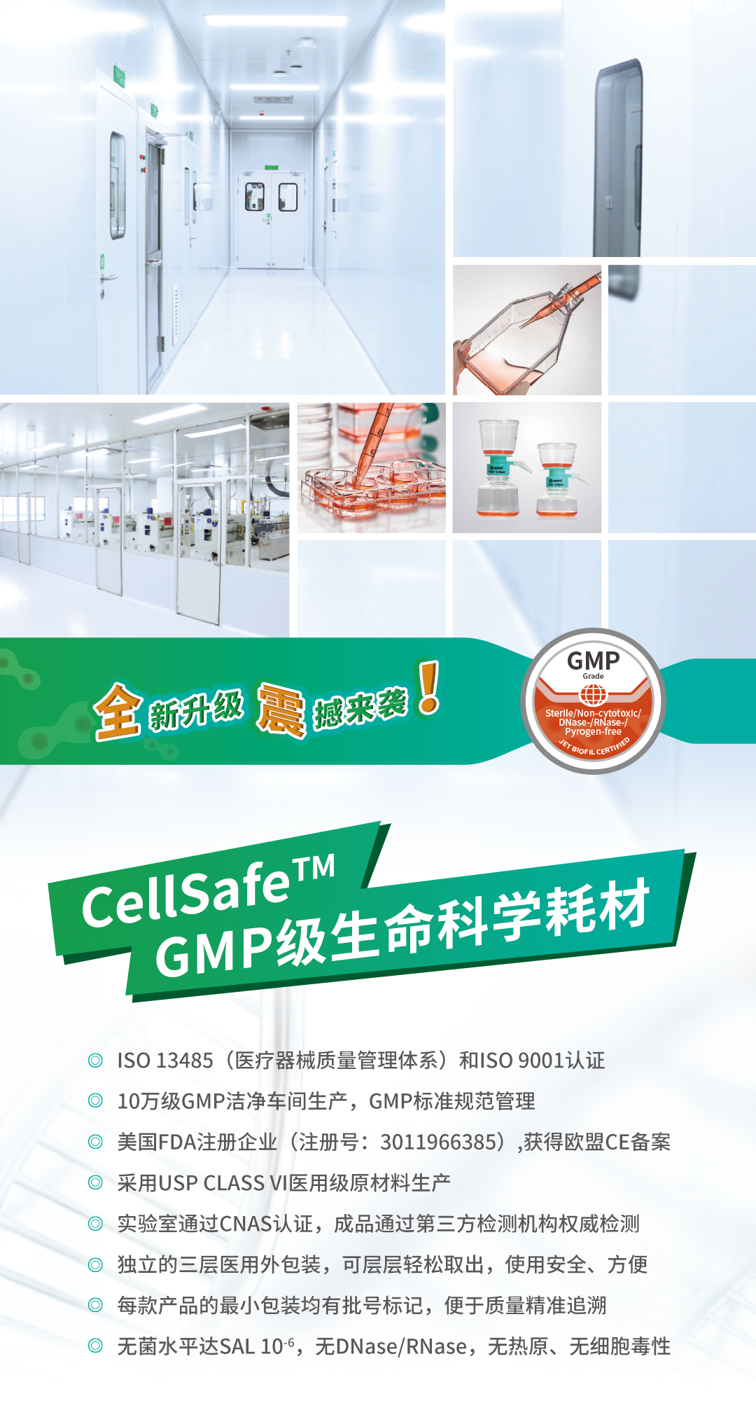 潔特生物GMP級生命科學(xué)耗材——CellSafe™系列產(chǎn)品全新升級、重磅來襲,該系列產(chǎn)品按照GMP質(zhì)量標(biāo)準(zhǔn)要求生產(chǎn),高潔凈度、高安全性,可滿足細(xì)胞治療、基因治療、抗體、疫苗等生物制藥企業(yè)及其他潔凈實驗室對生物實驗耗材有更高潔凈等級要求的標(biāo)準(zhǔn)化制造與規(guī)模化生產(chǎn)。