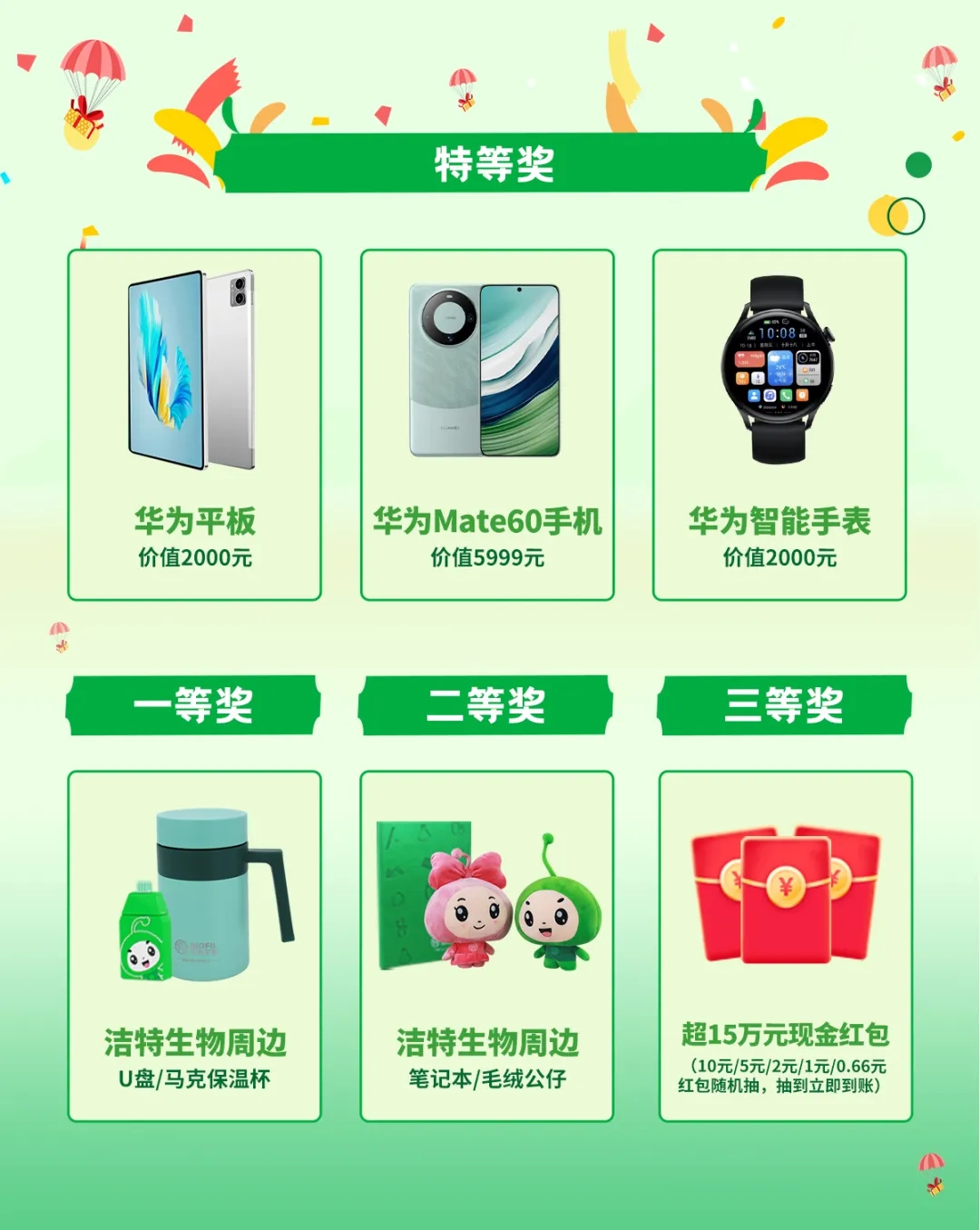 購買潔特生物細(xì)胞培養(yǎng)板、細(xì)胞培養(yǎng)瓶,開箱就能掃碼抽獎(jiǎng)!每箱活動(dòng)產(chǎn)品含有1~4個(gè)抽獎(jiǎng)二維碼,如果您購買了一箱活動(dòng)產(chǎn)品,您將獲得最多4次抽獎(jiǎng)機(jī)會(huì)哦!中獎(jiǎng)率高達(dá)90%以上!可以瓜分15萬元紅包池,更有華為Mate60手機(jī)/平板/手表、潔特生物周邊等你抱回家!