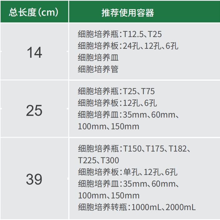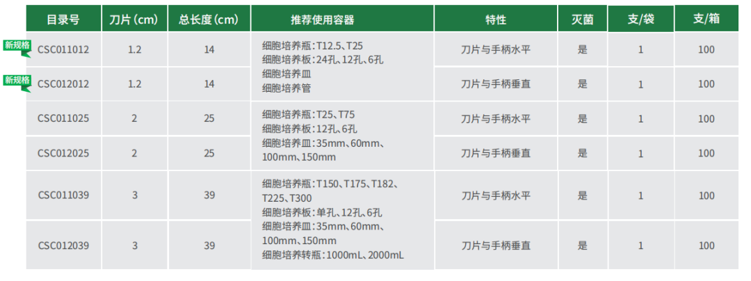 ◆ 細胞刮刀規(guī)格多樣,可滿足小型孔板至大容量培養(yǎng)瓶各種不同容器的細胞收集需求。