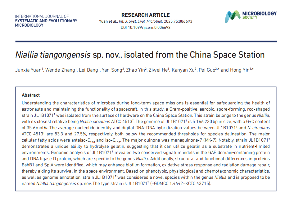 近日,中國科研團隊首次公布在空間站內(nèi)發(fā)現(xiàn)的全新微生物物種——“天宮尼爾菌”(Niallia tiangongensis),這一成果發(fā)表于國際權(quán)威期刊《International Journal of Systematic and Evolutionary Microbiology》,引發(fā)全球關(guān)注。