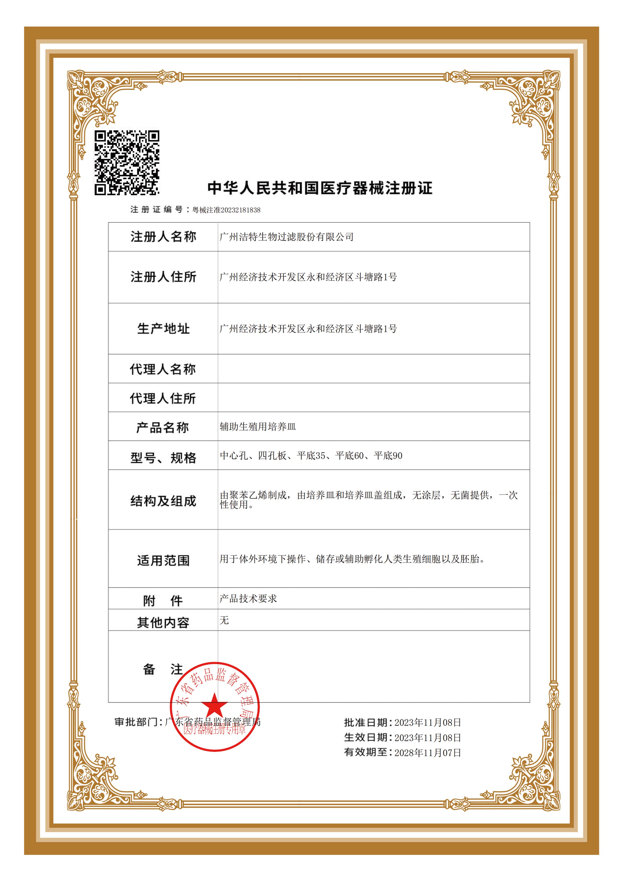 近年來(lái),潔特生物潛心研發(fā),開(kāi)拓了許多新的產(chǎn)品線,包括生物工藝系列耗材、輔助生殖系列耗材等,本次招商的是輔助生殖耗材,其中,輔助生殖專用培養(yǎng)皿已獲批醫(yī)療器械注冊(cè)證(注冊(cè)證編號(hào):粵械注準(zhǔn)20232181838)。